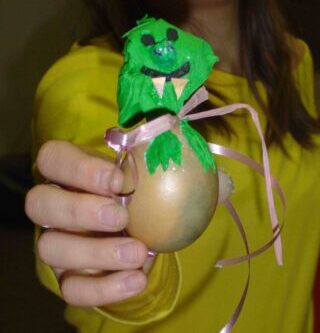 Aus Kochlöffeln kleine Hasen zum Hinstellen, Blumentöpfe, die mit Serviettentechnik und Eierschalen verziert wurden und zur Krönung eine Primel mit einem bunten Ei hineingepflanzt bekamen. Wir haben auch eine runde Holzplatte mit Hasen verziert. Und außerdem haben wir auch Stiftboxen gebastelt. Gebacken haben wir auch und zwar Plätzchen die wir mit gefärbtem Zuckerguss verziert haben. Sehr hübsch verzierte Grußkarten rundeten unser Angebot ab.
